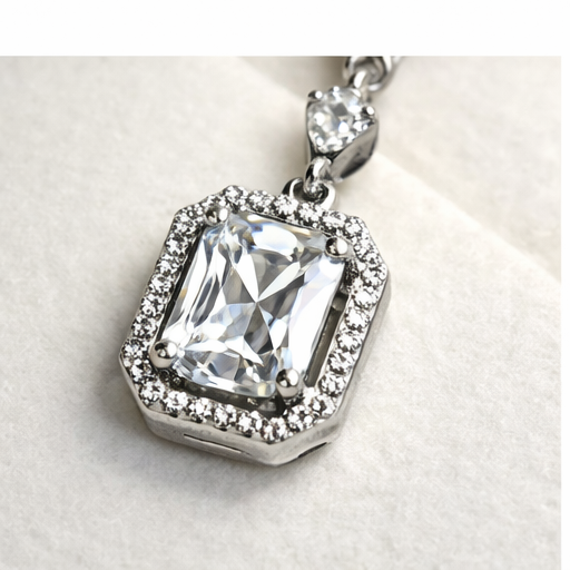 Elegant drop earrings featuring emerald-cut stones framed in a delicate halo, designed to catch the light with every movement.