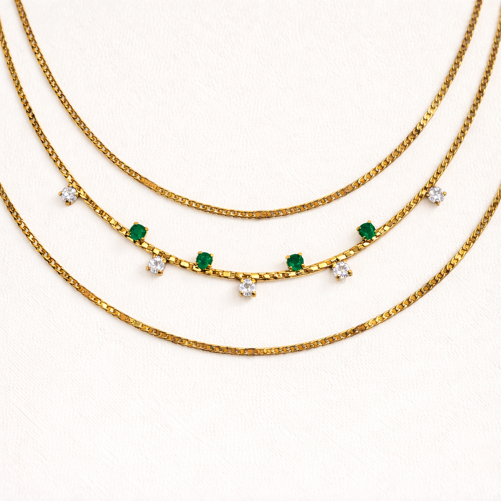 Emerald Trio Layer Necklace is your effortless “already-styled” piece—three delicate gold-toned layers designed to sit perfectly together. The center strand features alternating emerald-green and crystal-clear stones for a subtle sparkle that catches light with every move. Wear it solo for an elevated everyday look, or stack it with your favorite chains for extra shine.